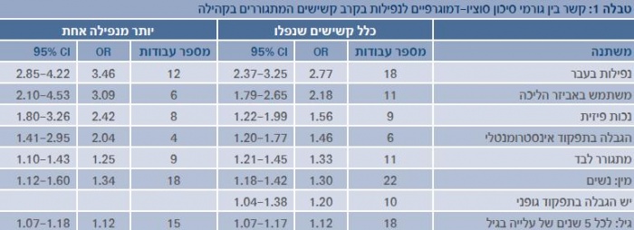 - קשר בין גורמי סיכון סוציו-דמוגרפיים לנפילות (טבלה 1): ניתן לראות ששלושת גורמי הסיכון הסוציו-דמוגרפיים המשמעותיים ביותר הם סיפור של נפילות בעבר (פי 2.8 בכלל קבוצת נופלים ופי 3.5 בקבוצת נופלים חוזרים), שימוש באביזר הליכה (פי 2.2 ופי 3.1, בהתאמה) ונכות פיזית (פי 1.6 ופי 2.4, בהתאמה). יצוין כי גורמי סיכון, כגון: מדד מסת גוף (BMI) והשכלה שנמצאו כסיבות לנפילות בעבודות שונות, לא הגיעו למובהקות סטטיסטית במטה-אנליזה זו