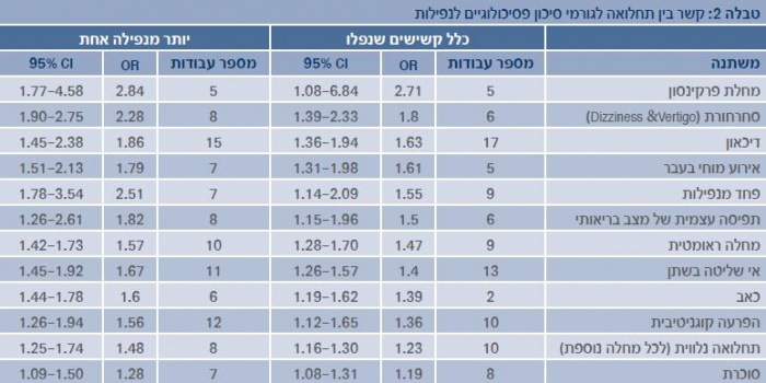 - קשר בין תחלואה וגורמי סיכון פסיכולוגיים לנפילות (טבלה 2): בקבוצת כלל הנופלים, שלושת גורמי הסיכון המשמעותיים ביותר היו מחלת פרקינסון, סחרחורת ודיכאון (יחס סיכויים: 2.7, 1.8 ו- 1.6 בהתאמה). בקבוצת הקשישים עם נפילות חוזרות, לחולים במחלת פרקינסון היו פי 2.8 יותר נפילות. במקום שני היה פחד מנפילות (פי 2.5 סיכוי ליפול) ובמקום שלישי – סחרחורת (פי 2.3). לחץ דם נמוך לא הגיע לסף של מובהקות סטטיסטית
