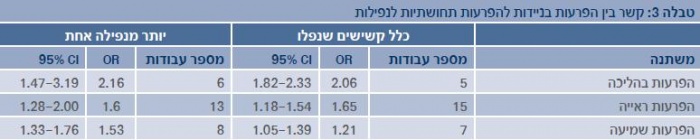 - קשר בין הפרעות בניידות והפרעות תחושתיות לנפילות (טבלה 3): בשתי הקבוצות (של כלל הקשישים שנפלו ונופלים חוזרים) הפרעות הליכה מגבירות סיכוי לנפילות ביותר מפי 2, הפרעות ראייה ביותר מ- 60% והפרעות שמיעה מגבירות סיכוי לנפילה בקרב כלל הנופלים ב- 21%, ובקרב הקשישים שנפלו יותר מפעם אחת ב- 53%