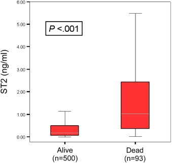 במחקר זה התברר ש-sST2 הוא מנבא עוצמתי של תמותה. חולים שנפטרו במהלך שנה אחת של המחקר היו בעלי ערך sST2 של 1.08 ננוגרם/מ"ל בהשוואה לאלה ששרדו (0.18 ננוגרם/מ"ל, ונמצא גם מתאם ברור בין רמות sST2 לבין שיעורי התמותה. גם באנליזה רבת-משתנים (multivariate), נותר sST2 מנבא חזק של תמותה תוך שנה אחת במטופלים עם או בלי HF. הערך הפרוגנוסטי של sST2 המתווסף לזה של NT-proBNP, הראה שבמטופלים בהם 2 מדדים אלה היו מוגברים היו בעלי הסיכון הגבוה ביותר של כמעט 40% תמותה במלך שנה אחת מהבדיקה (תמונה למטה) על פי Januzzi וחב' ב-Am J Cardiol משנת 2015). התמותה המוגברת באלה עם ערכי sST2 מוגברים נשארה בתוקף אף במהלך 4 שנים מביצוע בדיקה זו.