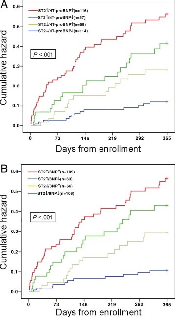 שיעורי תמותה במטופלים מבוטאים כפונקציה של רמות ST2 ושל רמות (A) ‏ NT-proBNP ו-(B) ‏ BNP