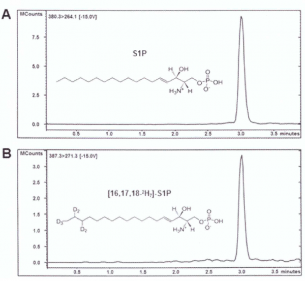 כרומטוגרמים אופייניים של LC-MS/MS עבור S1P (A) ועבור S1P-d7 (internal standard) (B).