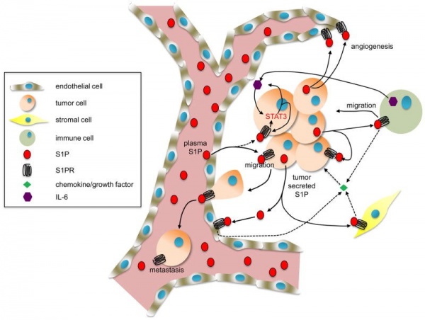 מעורבות של S1P בתהליך הסרטני: S1P מווסת מספר גדול של תהליכים בתאים סרטניים, ובסביבה המידית של גידולים סרטניים החיוניים לממאירות, כולל שגשוג תאי סרטן, הישרדותם, נדידה של תאי סטרומה ואנגיוגניות. S1P קשור גם כן לגיוסם של תאי דלקת, ולהפרשה של ציטוקינים וכימוקינים החיוניים לתהליכי דלקת וטומורוגניות.