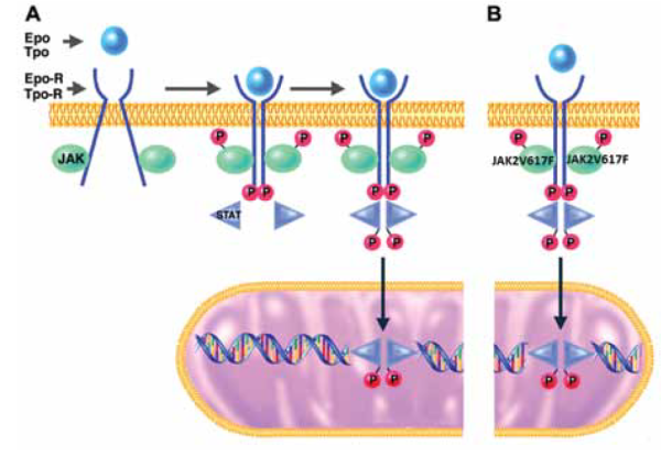 קישור גורם גדילה, כמו אריתרופויטין או טרומבופויטין, לרצפטור שלו על גבי ממברנת התא (A) מביא לשינוי מבני ברצפטור באופן שמאפשר קרבה של חלבוני JAK2 זה לזה, זרחון שלהם, של הרצפטור ושל חלבוני העברת סיגנל תוך-תאיים כמו STAT. חלבוני STAT שעברו שפעול על ידי זרחון נכנסים לגרעין ופועלים כפקטורי שעתוק. המוטציה JAK2V617F גורמת לזרחון קבוע של חלבוני JAK, רצפטורים וחלבוני STAT, באופן שאינו תלוי בקישור גורם גדילה לרצפטור (B). כך מתרחשת העברת סיגנל ממושכת ושיעתוק גנים הקשורים לשגשוג תאים באופן קבוע[2].