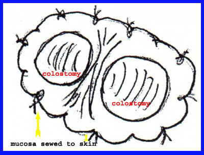 - פיום מוסט של הכרכשת - Diverting colostomy - בקולוסטומיות אלה, לאחר כריתת קטע כרכשת, פותחים שני פתחים נפרדים בעור. דרך האחד, מוציאים את הקטע הקריבני המנקז את הצואה מהמעי, ודרך האחר מוציאים את החלק הרחיקני של הכרכשת - נצור רירי (Mucous fistula) - המנקז את הריר הנוצר בחלק זה של המעי (איור 11.6).