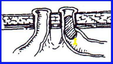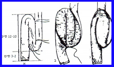 - ב. דו-פיום הכרכשת - Double barreled colostomy - הלולאה נכרתת, ושני קצות המעי הגס, הרחיקני (דיסטלי) והקריבני (פרוקסימלי), מוצאים דרך אותו פתח בעור (איור 7.6).