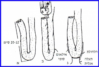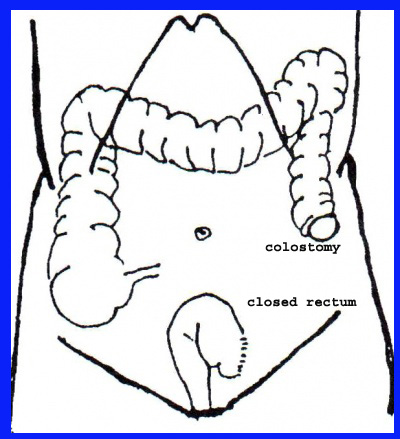 - 2. Single barreled - רק הקצה הקריבני מוצא דרך דופן הבטן, ואילו הקצה הרחיקני נשאר בבטן כמו בניתוח על-שם Hartmann (איורים 9.6 ו-10.6).