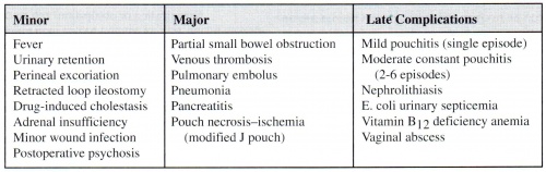 שכיחות חסימות המעי הדק היא 27%-11% מהמנותחים, לפחות מחציתם נזקקו לניתוח. סיבוך שכיח אחר המדווח בספרות הוא דלקת המאגר (Pouchitis). השכיחות גבוהה פי 5 בדלקת מעי מאשר בפוליפוזיס (31% ו-6%, בהתאמה). האטיולוגיה של הדלקת אינה ידועה. הסיבוכים המדווחים מופיעים בטבלה 2.6.