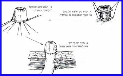 - ג. פיום מוחצן של הכרכשת - Exteriorized colostomy - לולאה שלמה מוצאת אל מחוץ לעור ונכרתת בגובה זה לאחר סגירת הבטן (איור 8.6).