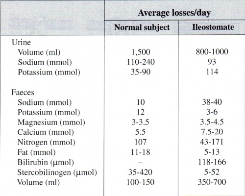 מכיוון שתוכן המעי הדק הוא נוזלי, חולים אלה מפרישים כמות גדולה מאוד של נוזלים, שנמדדת בליטרים, מיד לאחר הניתוח. הפרשה זו הולכת ופוחתת עד 800-500 סמ"ק ביום לאחר תהליך של הסתגלות (טבלה 1.6).