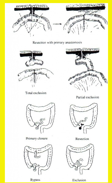 יש לכרות את קטע המעי, כולל הנצור, ולבצע השקה בין קטעי המעי הבריאים. בחולים, הלוקים גם בחסימה רחיקנית, יש לשחרר את החסימה ולכרות את קטע המעי עם הנצור. לעתים הגישה לנצור קשה או בלתי אפשרית, ואז יש לבצע מעקפים לנטרול הנצור כדי לבודדו ולמנוע מעבר תוכן דרכו. השיטה הניתוחית היא ניתוק קטע המעי המכיל את הנצור, פיום הקצוות הנותרים והשארת הקטע ובו הנצור סגור משני צדדיו - Total exclusion. גישה אחרת היא ה- Partial exclusion, שבה מנתקים רק את הקטע הקריבני לנצור ומבצעים פיום בינו לבין המעי המחובר לנצור, אבל מעבר לנצור (איור 12.4). בכל מקרה אין לבצע כריתה של תעלת הנצור בלבד ולסגור את פתח הנצור במעי, מכיוון שבמקרים אלה שיעור החזרות של הנצורים הוא גבוה מאוד.