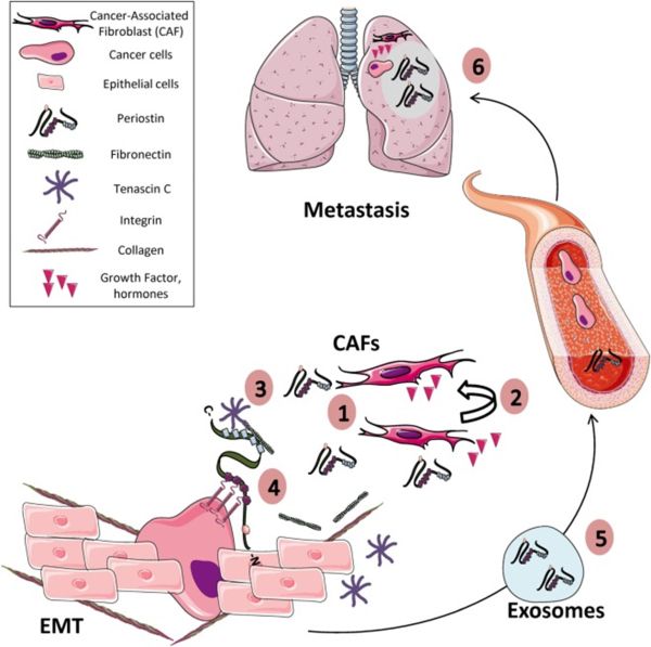 (4) בנוסף, POSTN מגיב עם קולטני integrin המופיעים על הממברנה של תאי הגידול הסרטניים, לעודד תהלכי פרוליפרציה של תאים אלה, הישרדותם, נדידתם ו-EMT (או epithelial–mesenchymal transition)