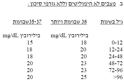 - בילוד מעל 24 שעות - רמת בילירובין מעל 18mg/dl, או 2–3 מגי פחות מהרמה להחלפת דם