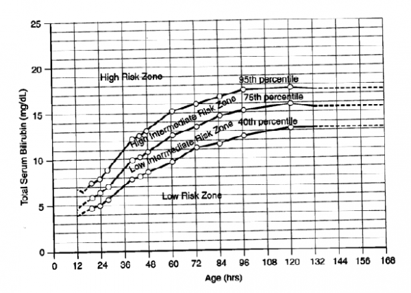 - רמת בילירובין - מעל אחוזון 95 (High risk zone) - אחוזון 75–95 (Intermediate high risk zone)