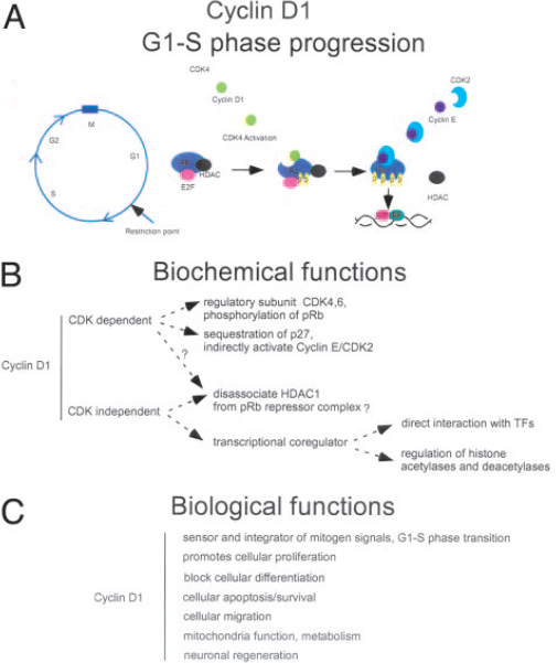 Cyclin D1 הוא תת-היחידה הרגולטורית של holo-enzymes המזרחנים, וביחד עם זרחון רציף על ידי cyclin E/CDK2 גורמים לאינאקטיבציה של מחזור התא על ידי העיכוב של retinoblastoma protein (להלן pRb). ה-pRb משמש כ"שומר השער" של פאזת G1 כאשר מעבר דרך נקודת הקִטּוּעַ (restriction point) מוביל לסינתזה של DNA (Baldin וחב' ב-Genes Dev משנת 1993, ו-Sherr ב-Cancer Res משנת 2000). ביטוי-יתר של cyclin D1 מקובל ככרוך באתחול המוקדם של תהליך סרטני ובסכנה של התפתחות הסרטן וגרורותיו (Motokura ו-Arnold ב-Genes Chromosomes Cancer משנת 1993, Zhang וחב' ב-Biochim Biophys Res Commun משנת 1993, Bartkova וחב' ב-Int J Cancer משנת 1994, Afar וחב' ב-Proc Natl Acad Sci USA משנת 1995, Callanan וחב' ב-Crit Rev Oncog משנת 1996, Gansauge וחב' ב-Cancer Res משנת 1997, Barnes ו-Gillett ב-Breast Cancer Res Treat משנת 1998, Diehl ב-Cancer Biol Ther משנת 2002, Stacey ב-Curr Opin Cell Biol משנת 2003, ו-Chung ב-Ann NY Acad Sci משנת 2004). עם זאת, מספר מחקרים לא מצאו במפתיע קשר בין ביטוי מוגבר של cyclin D1 לבין סינתזה מוגברת של DNA בגידולים סרטניים (Oyama וחב' ב-Cancer Res משנת 1998, ו-Shoker וחב' ב-Br J Cacer משנת 2001).