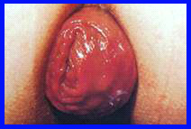 צניחת החלחולת דרך פי הטבעת נראית כגוש הבולט בפי הטבעת ומלווה בהפרשה רירית תמידית (תמונה 2.7).