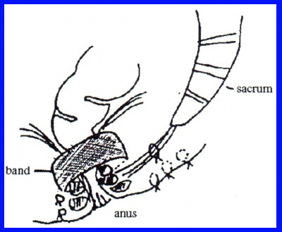 - ניתוח על-שם Thiersch: בניתוח זה דוחפים את הרירית השמוטה לחלחולת, מעבירים חוט מתכת סביב פי הטבעת, מחוץ לסוגרים, וקושרים אותו מעל האצבע המצויה בפי הטבעת. שיטה זו גורמת להצרת התעלה האנלית, ולכן מונעת הישמטות של רירית החלחולת החוצה (איור 10.7).