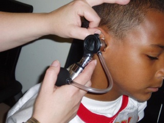 בדיקה בעזרת אוטוסקופ פנאומטי בעל גוף מתכתי.התמונה מוצגת באדיבות מחלקת הילדים בבית החולים של פיטסבורג [1]