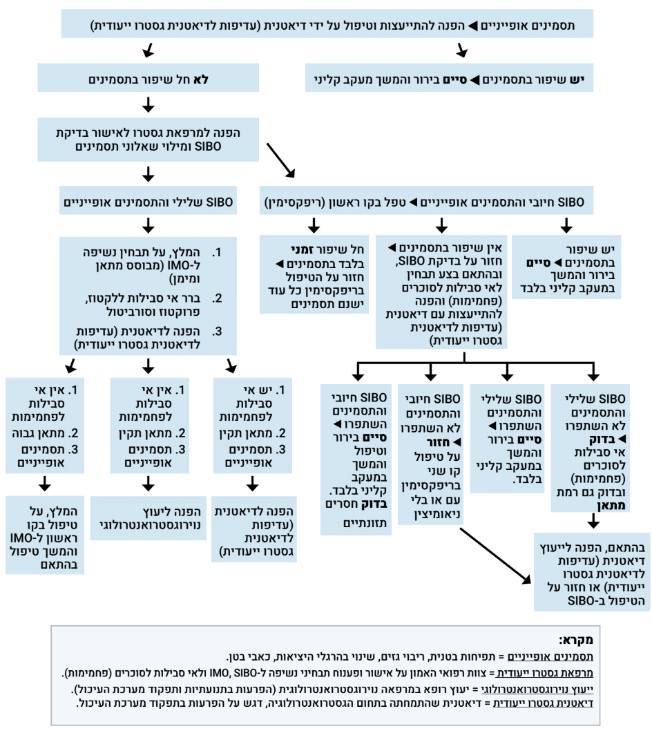 תרשים זרימה - תבחיני נשיפה לבירור חשד ל-IMO ,SIBO, ולאי סבילות לסוכרים )פחמימות( במטופל עם תסמינים אופייניים: תפיחות בטנית, ריבוי גזים, שינוי בהרגלי היציאות וכאבי בטן