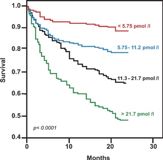 יחס ישר בין הריכוז של קופפטין (פרו-וזופרסין) ושל הפפטיד הנטריורטי NT-proBNP לבין סיכון לתמותה בקרב קשישים שסבלו מתסמינים של אי-ספיקת לב
