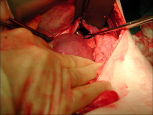 תמונה 5.16: קרע בסרעפת ותפירתה. עליון ימין רואים את הקרע, עליון משמאל חשיפת הקרע. תחתון תפירת הקרע