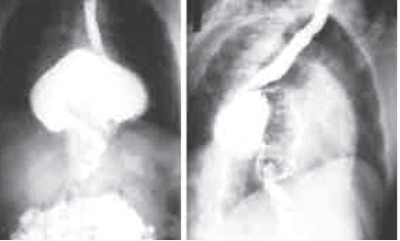 תצלום 20.16: צילום חזה לאחר בליעת בריום המראה קיבה ומעי דק בבית החזה דוחקים את הריאה (חיצים מורים על הקיבה והמעי שבבית החזה).