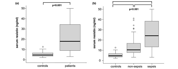 (a) רמות resistin מוגברות משמעותית (p<0.001) ב-170 מטופלים בהשוואה ל-60 אנשים בריאים; (b) רמות resistin מוגברות משמעותית (p<0.001) בחולים עם ספסיס (n=122) לעומת 48 מטופלים ללא-ספסיס (n=48).