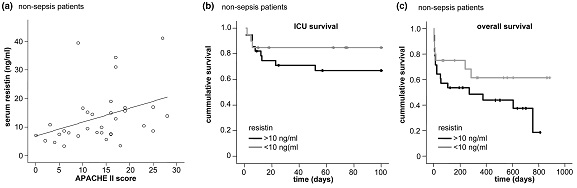 (a) רמת resistin נמצאת במתאם עם מדרג APACHE II (r=0.481, p=0.005) ב-48 מטופלים ללא ספסיס; (b ו-c) רמות resistin בנסיוב משמשות סמן פרוגנוסטי במטופלים בטיפול נמרץ ללא ספסיס: עקומות Kaplan-Mayer של הישרדות כאשר ערכי resistin גבוהים או נמוכים מ-10 ננוגרם/מ"ל.