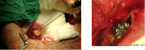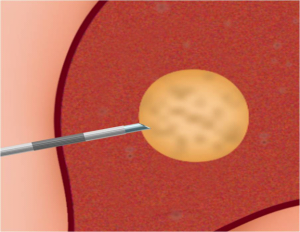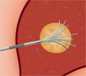 | תמונה 11.10: RFA . משמאל החדרת המחט לגידול. מימין פתיחת הזרועות דרכן יעברו גלי הרדיו ויהרסו את השאת. | |