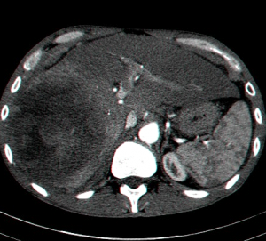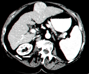 | תצלום 30.10: שאת בכבד הנראית ב- CT. מימין HCC הבולטת על פני הכבד. משמאל פגם מילוי בכבד כביטוי לשאת בכבד (החץ מצביע על השאת). | |