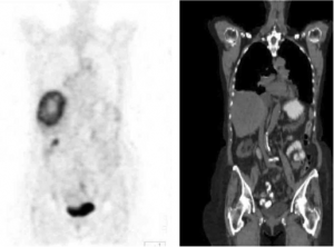 | תצלום 38.10: שני תצלומים משמאל - ב- CT נראה פגם מילוי בכבד. שני תצלומים מימין - הפגם "נצבע" על ידי FDG ממצא המעיד על תהליך פתולוגי בכבד. | |