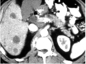| תצלום 37.10: גרורות מרובות בכבד הנראות ב- CT (חץ). | |