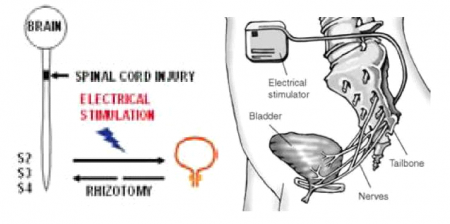 מימין: גירוי שורש S3 על ידי אלקטרודה הנמצאת בנקב (Foramen) הסקראלי השלישי המחוברת בכבל חשמלי אל סטימולטור המושתל מתחת לעור הבטן. הסטימולטור מייצר גירוי כאשר מושם עליו מגרה חיצוני