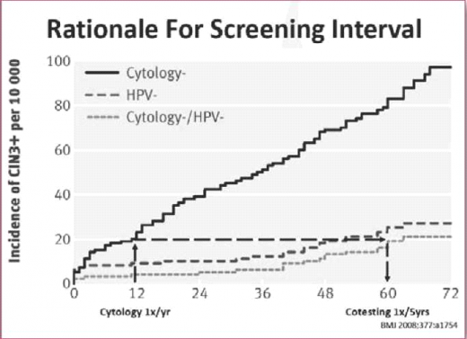 הסיכוי לפתח נגע טרום-סרטני או סרטן צוואר הרחם 5 שנים לאחר בדיקת HPV DNA שלילית דומה לסיכון לאחר שנה מקבלת תשובה שלילית לבדיקת פאפ (תרשים 3),[17], לכן מומלץ לבצע סקר מבוסס HPV DNA אחת ל-5 שנים[18].