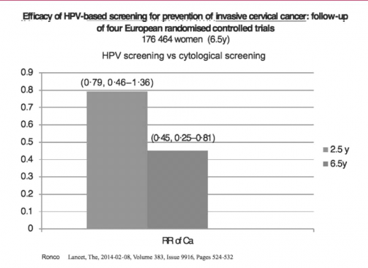 האם לגילוי המוקדם של נגעים טרום-סרטניים על ידי סקר מבוסס HPV DNA יש השפעה על התפתחות סרטן פולשני? לפי מחקר שפורסם על ידי Ronco וחבריו בקבוצת נשים אשר השתתפו בסקר מבוסס על בדיקת HPV DNA, ההיארעות של סרטן פולשני כעבור 6.5 שנים הייתה נמוכה בהשוואה לקבוצה שהשתתפה בסקר מבוסס בדיקה ציטולוגית[12].