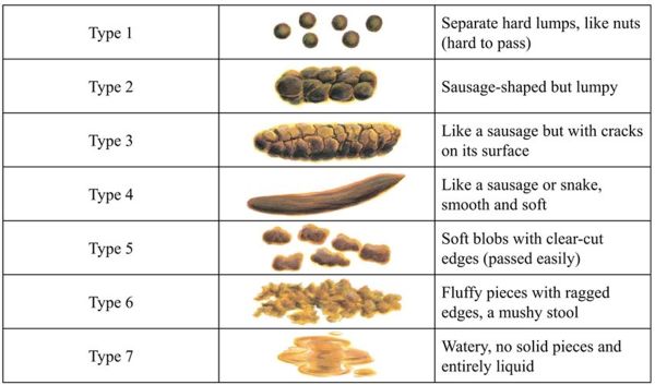 • צורת צואה שאינה תקינה (גושית וקשה או מימית)