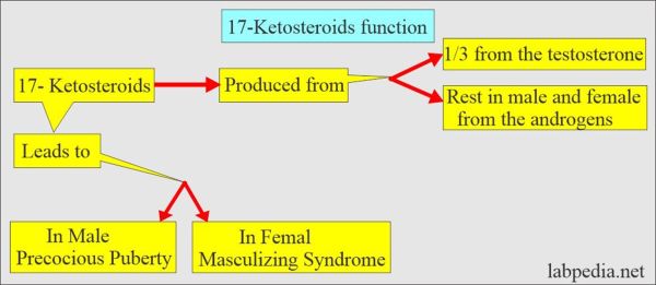 ketosteroids-17 נוצרים כאשר הגוף מפרק את הורמוני המין הסטרואידים הזכריים הידועים כאנדרוגנים, וכן את ההורמונים המופרשים מבלוטות האדרנל בשני המגדרים, או מהאשכים. דוגמאות ל-ketosteroids-17 כוללות את androstenedione, androsterone, estrone ו-dehydroepiandrosterone. אנדרוגנים מהאדרנל הנמדדים כ-ketosteroids-17 כוללים את dehydroepiandrosterone ואת etiocholanolone ואת המטבוליטים שלהם. בזכרים, בערך 2/3 מה-ketosteroids-17 מופרשים מהקורטקס של האדרנל, ו-1/3 מה-ketosteroids-17 שלהם נוצר מהטסטוסטרון המיוצר באשכים. בנקבות כמעט כל הכמות של ketosteroids-17 מופרשת על ידי הקורטקס האדרנלי. ניתן אם כך לקבוע שבשני המגדרים מדידת ketosteroids-17 בשתן, משקפת את התפקוד של קליפת האדרנל. בדיקה חלופית וספציפית יותר לקביעת תפקוד האנדרוגן האדרנלי היא מדידת dehydroepiandrosterone sulfate בנסיוב. אנדרוגנים וטסטוסטרון עוברים מטבוליזם ל-17-ketosteroid. המטבוליטים המופרשים העיקריים של טסטוסטרון הם: androstenedione ו-DHEA. תוצר המטבוליזם הסופי של 17-Ketosteroid המופרש בשתן הוא dehydroepiandrosterone. ketosteroids-17 אינם המטבוליטים של קורטיזול, ולפיכך אינם מצביעים על יצירת קורטיזול.