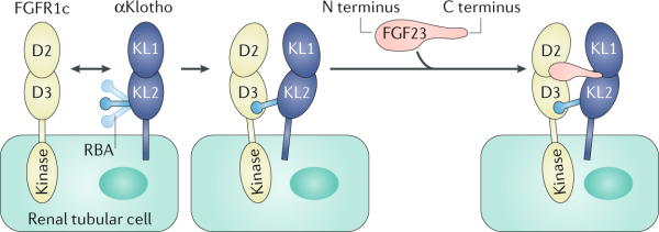 הקומפלקס השלישוני של FGF-23 של αKlotho ושל FGFR1c דורש heparan sulfate על מנת לעבור דימריזציה ולשפעל את האנזים טירוזין קינאזה של הקולטן FGFR1c, אף על פי שהזיקה שלו ל-FGF-23 נמוכה, heparan sulfate מגיב עם FGFR1c כמו גם עם FGF-23.{{כ]] βKlotho גובש עם או בלי FGF-21 (Lee וחב' ב-Nature משנת 2018), ובדומה לאינטראקציה של αKlotho עם FGF-23, βKlotho מגיב ישירות עם הקצה ה-C טרמינלי של FGF-21. יש אפשרות שיש ל-αKlotho שותפים להתקשרות, השונים מקולטני FGF, מה שעשוי להסביר את הפונקציות המגוונות של αKlotho מסיס שאינן תלויות ב-FGF-23 (Kuro-o ב-Nature משנת 2018). אם לוקחים בחשבון את התפקיד של ה-FGFs האנדוקריניים במגוון של תגובות פיזיולוגיות, כולל המטבוליזם המינרלי והאנרגטי, תגובות עקה ותהלכי הזדקנות, אגוניסטים ואנטגוניסטים של הורמונים אלה הם מועמדים פוטנציאליים לתרפיה במפגעים שונים (Lan וחב' ב-Cell Metabolism משנת 2017, ו-Gaich וחב' באותו כתב עת משנת 2013).