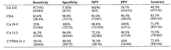 יצוין יחד עם זאת ש-Salama וחב' במאמרם משנת 1998 ב-Br J Cancer מצאו ערכים זהים לחלוטין של רגישות ושל ספציפיות לערכי CEA ו-CYFRA 21-1 באבחון של ממאירות בנוזל פלאורלי, ובדומה Alatas וחב' ב-Lung Cancer משנת 2001 מצאו בבחינת נוזל זה עדיפות ל-CYFRA 21-1 על CEA בבחינת ממאירות על ידי מדידת רמות 2 סמנים אלה בנוזל פלאורלי: ל-CEA נקבעו ערכי רגישות, ספציפיות ודיוק של 52%, 77% ו-62%, בהתאמה, ואילו ל-CYFRA 21-1 נקבעו ערכי רגישות, ספציפיות ודיוק של 91%, 90% ו-91% , בהתאמה.