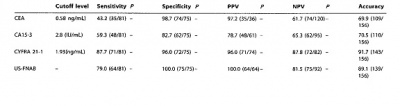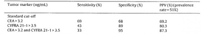 כאשר חלקו את משתתפי המחקר על פי הסטאטוס הקליני שלהם בבית החולים נמצא שערך הניבוי החיובי (ppv) באשר למחלתם, היה 69.2% במדידת CEA ו-80.3% במדידת CYFRA 21-1, מה שמדגיש את המשמעות של מדידת הסמן האחרון, ואת עובדת היותו סמן אמין לאבחון סרטן ריאות בהיותו מתווסף לבדיקת דימות כ-CT. כמו כן הסיקו בעלי מחקר זה שהתייחסות משולבת לשני הסמנים CYFRA 21-1 ו-CEA אף משפרת את העוצמה האבחונית.