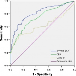 בשנת 2013 פרסמו Okamura וחב' ב-Lung Cancer את ממצאי מחקרם על הערך האבחוני של CEA ושל CYFRA 21-1, בהבדלה של גידול ראשוני בריאות ממחלת ריאות שפירה. רמות 2 סמנים אלה נמדדו רטרוספקטיבית בנסיוב של 655 חולים בסרטן ריאות, ושל 237 מטופלים עם מחלת ריאות שפירה. ערכי סף-נורמה עליון נבחרו כ-3.2 ננוגרם/מ"ל לגבי CEA ו- 3.5 ננוגרם/מ"ל לגבי CYFRA 21-1. נמצא שרמות CEA היו מוגברות ב-32% מהמטופלים עם מחלת ריאות שפירה, כאשר רק ב-11% מאלה עם מחלה שפירה נמצאו ערכים מוגברים של CYFRA 21-1. הרגישו והספציפיות של CEA באבחון סרטן ריאות, נקבעו כ-69% ו-68%, בהתאמה. לעומת זאת, הרגישות והספציפיות של CYFRA 21-1 נקבעו כ-43% ו-89%, בהתאמה.