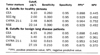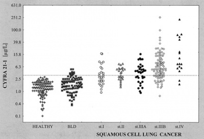 הממצאים במאמרם של Kulpa וחב' שהופיע ב-Clin Chem משנת 2002 היו כדלקמן: ארבעת סמני הסרטן הללו נמדדו ב-200 מאובחנים ב-squamous cell lung cancer בלתי מטופלים, ובקבוצת ביקורת של 220 איש (מתוכם 124 בריאים לחלוטין ו-96 מטופלים עם מחלת ריאות בלתי ממאירה). בנבדקים עם SCLC רמות CEA ,SCC-Ag ,NSE ו-CYFRA-21-1, נמצאו גבוהים מספי הנורמה העליונים שלהם ב-28%, ב-32%, ב-26% וב-67%, בהתאמה. השטח מתחת עקומת ROC עבור CYFRA 21-1 נמצא גבוה יותר משמעותית בהשוואה לשטחים אלה שנקבעו עם 3 הסמנים האחרים, כל אלה כנגד נבדקי ביקורת. CYFRA 21-1 ו-CEA נמצאו גבוהים יותר משמעותית במחלת SCC מתקדמת בהשוואה לערכי 2 סמנים אלה בשלבי מחלה מוקדמים (p<0.0001 ו-p<0.0004, בהתאמה). בניתוח רב-משתנים של ההישרדות, נמצא ש-CYFRA 21-1 הוא גורם פרוגנוסטי בלתי-תלוי בקבוצת חולים בשלב מוקדם של SCC, ואילו NSE הוא גורם פרוגנוסטי בלתי-תלוי בשלבי מחלה מתקדמים.