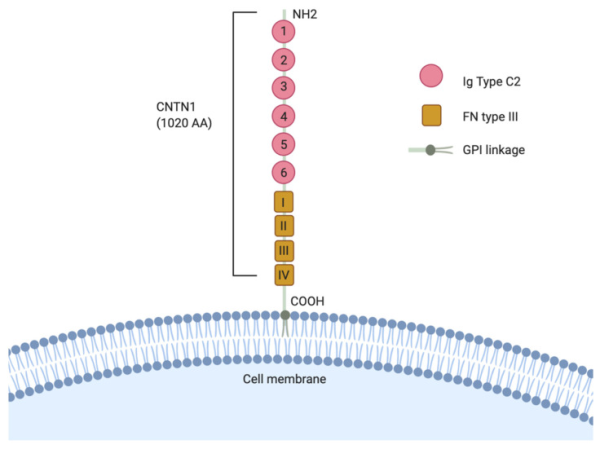 בין ששת החברים במשפחת CNTN, הראשון שזוהה הוא CNTN1 שנחקר בצורה היסודית ביותר לתפקידו במפגעים פתולוגיים (Gennarini וחב' ב-Mol Cell Neurosci משנת 2017). מולקולת CNTN1 מורכבת משישה מקטעים N-טרמינליים של אימונוגלובולין C2, המלווים על ידי ארבעה החזרים של פיברונקטין type III בקצה ה-C-טרמינלי, וכן רצף של חומצות אמינו בקצה ה-C-טרמינלי. CNTN1 מבוטא בעיקר במוח האדם וברקמות נוירונליות, אך מבוטא באופן מוגבל גם ברקמות אחרות. CNTN1 פועל בעיקר כגליקופרוטאין אקסונלי הקשור לגדילת אקסונים ונויריטים (Bizzoca וחב' ב-Cell Adhes Migr משנת 2009), אך גם משחק תפקיד חשוב בתהליכי התפתחות נוירונלית כגון התמיינות והתפתחות של תאי glia, מיאלינציה, סינפטוגנזה ותנועת התכווצות בלתי רצונית של שריר (fasciculation) (Çolakoğlu וחב' ב-Proc Natl Acad Sci USA משנת 2014, Dityatev וחב' ב-Neuron Glia Boil משנת 2008, ו-Hu וחב' ב-Cell משנת 2003). עכברים טרנסגניים שהם משוללים CNTN1, הם בעלי פנוטיפ של המוחון בו סיבים מקבילים של נוירונים בגרנולות תאיות פגועים באוריינטציה שלהם, במקביל להפחתה של 25% בנפח המוחון, מה שתומך בחשיבותו של CNTN1 בהכוונת האקסון (Berglund וחב' ב-Neuron משנת 1999). מוטנטים הומוזיגוטיים של CNTN1 היו קטלניים בעכברים ביום ה-18 לאחר הלידה, מה שניתן לייחס לפעילות פגועה של המוחון, המפריעה להתנהגות אכילה נורמלית.