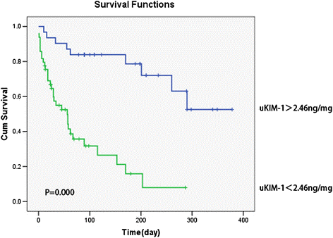 רמות KIM-1 בשתן והפרוגנוזה להישרדות במטופלים עם AKI. ערכים מעל 2.46 ננוגרם/מיליגרם קראטינין כרוכות עם פרוגנוזה פחות טובה. Cum- cumulative