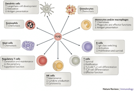 TGF-β הוא ציטוקין רב-תכליתי השייך למשפחת העל של TGF המכילה ביונקים שלושה איזופורמים שונים (TGFβ1 עד TGFβ3), וחלבנים מאותתים רבים אחרים (Meng וחב' ב-Nature Rev Nephrol משנת 2016). חלבוני TGF מיוצרים על ידי כל שורות תאי הדם הלבנים. TGFβ משופעל יוצר קומפלקסים עם פקטורים אחרים ליצירת קומפלקס serine/threonine kinase הנקשר לקולטני TGFβ. קולטנים אלה מורכבים משתי תת-יחידות type 1 ו-type 2. לאחר קישור TGFβ, הקינאז של הקולטן type 2 מזרחן ומשפעל את הקינאז של הקולטן type 1, ובכך משופעת הקסקדה המאותתת (Massagué ב-Nature Rev Mol Cell Biol משנת 2012). כך מתרחש שפעול של מצעים שונים ושל חלבונים רגולטוריים, כולל השעתוק של גנים שונים הפועלים בהתמיינות התא (differentiation), בכמוטקסיס, בפרוליפרציה, ובשפעול של תאי חיסון רבים (Nakao וחב' ב-Nature משנת 1997).